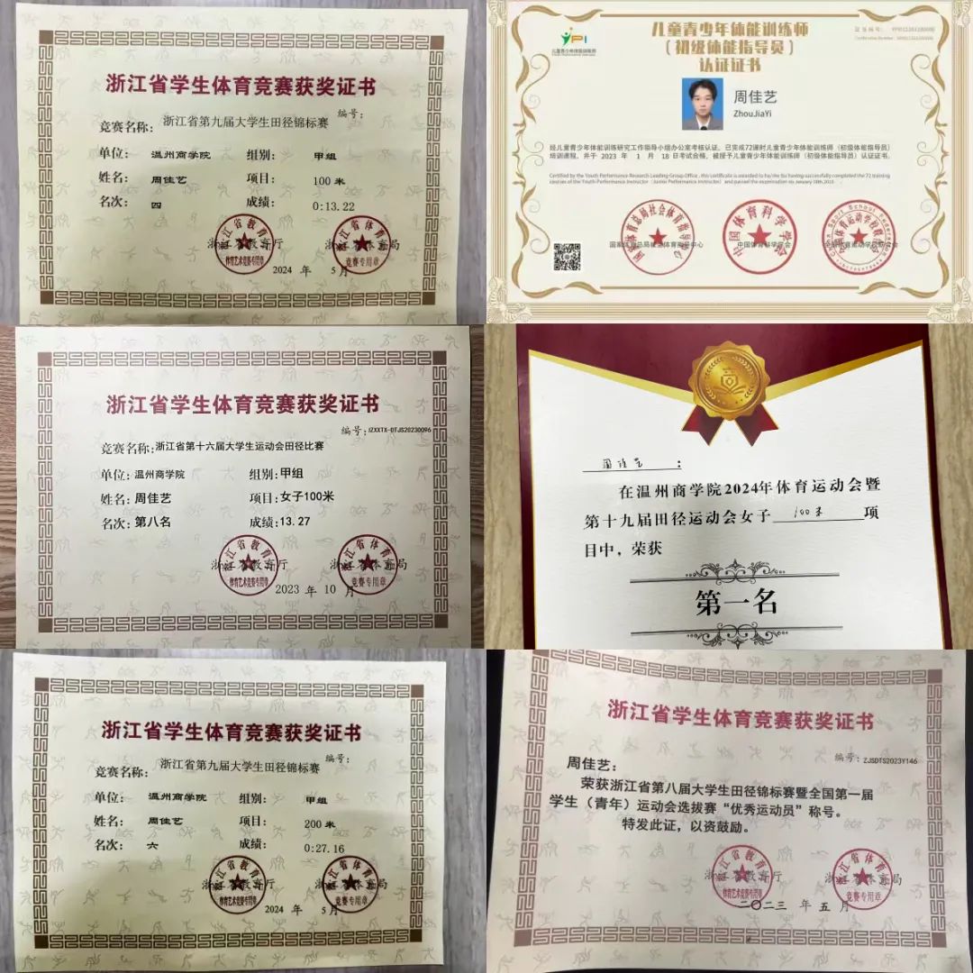 赛场拼搏之余,周佳艺在学业上同样一路 “狂飙”。专业排名第六,绩点 3.8,亮眼成绩背后是挑灯夜读、课堂全神贯注的积累。诸多荣誉纷至沓来,浙江省政府奖学金、国际励志奖学金、校级三好学生、学业一等奖学收入囊中,“文武双全” 是她最贴切的写照。课余时间,她也丝毫不松懈,各类裁判和教练证、普通话二甲证书等,皆被她逐一拿下,全方位磨砺自身能力。