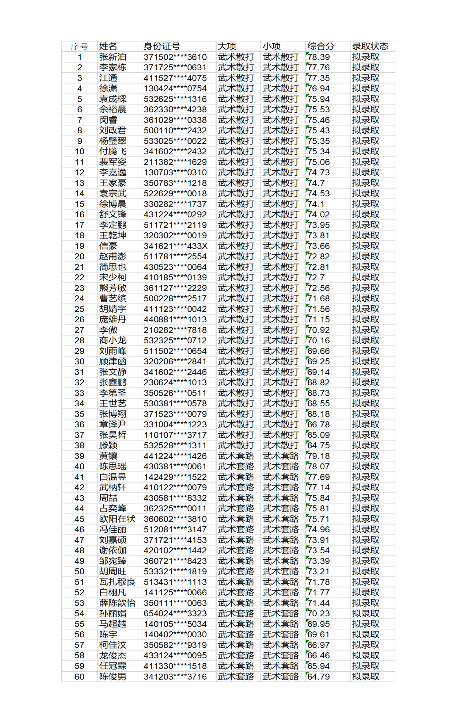 根据国家体育总局办公厅、教育部办公厅制定的《2024年普通高等学校运动训练、武术与民族传统体育专业招生管理办法》(体科字〔2023〕188号)规定及学校公布的《云南民族大学武术与民族传统体育专业2024年招生简章》,现将云南民族大学2024年武术与民族传统体育专业招生计划及拟录取名单公示如下