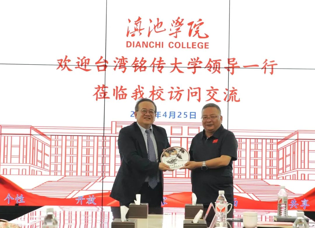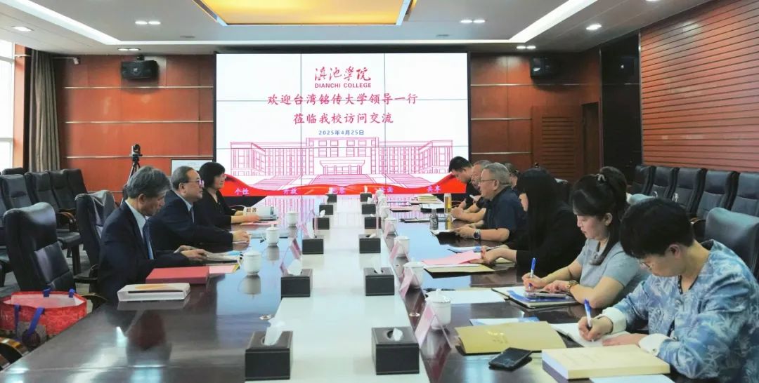 2025年4月25日,台湾铭传大学副校长王金龙教授、产推处杨宗蘅副处长、应急管理中心主任张平吾一行来访我校。滇池学院马杰校长在海埂校区崇志楼热情接待来宾,法学院杨云鹏院长、创新创业学院董辉院长,港澳台事务办公室、学生处、人事处、教务处等有关单位负责人参加座谈交流。