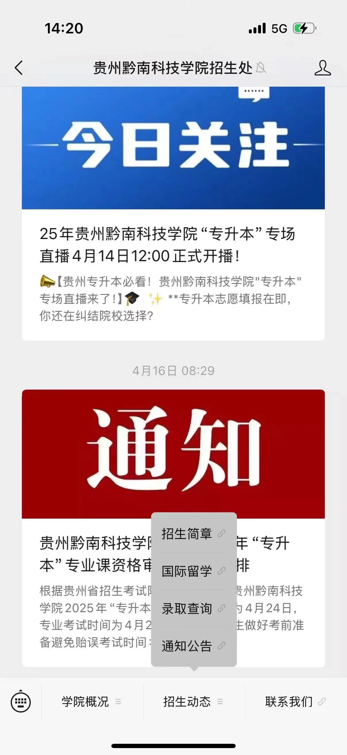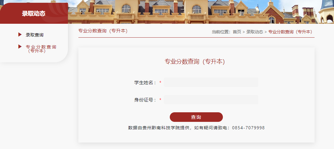 方法二:考生进入”贵州黔南科技学院招生处“微信公号,在“招生动态”栏点击“录取查询”端口,并在录取查询端口下的“专业分数查询(专升本)”栏中输入“姓名+身份证号”查询分数(温馨提示:电脑登录微信点击公众号查询)。