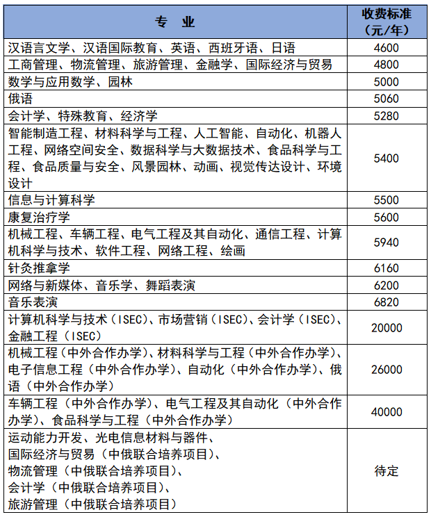 注:国际经济与贸易(中俄联合培养项目)、物流管理(中俄联合培养项目)、会计学(中俄联合培养项目)、旅游管理(中俄联合培养项目)4个专业为长春大学与俄罗斯太平洋国立大学联合培养,学生可同时获得两校的学历学位。第一、三学年在长春大学中文授课,第二、四学年在太平洋国立大学俄语授课,第二、三学年中俄双方学生混合编班授课。