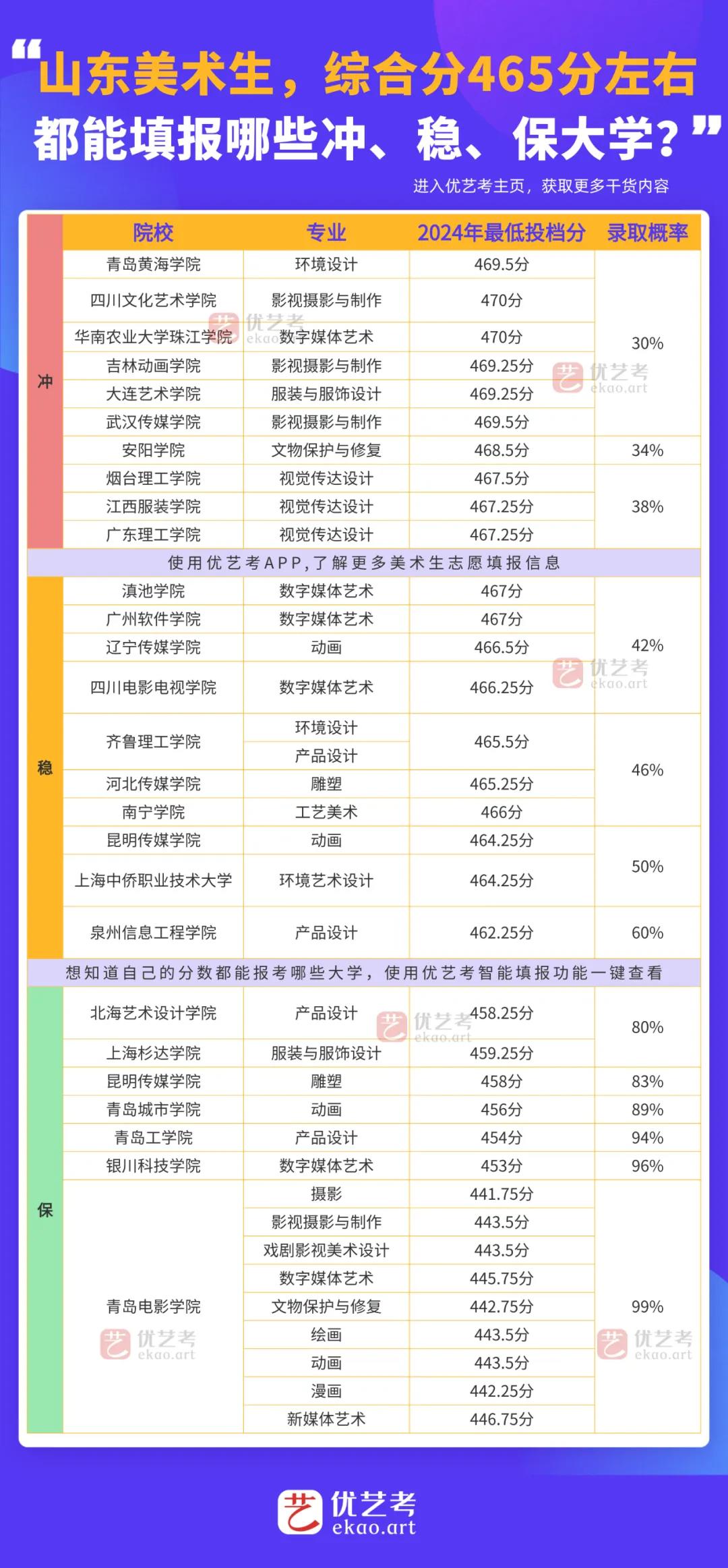 2025年山东省美术与设计类统考人数约为4.14万人,山东作为艺考大省,高考志愿填报也是不少考生和家长最为头疼的事;今天优艺考就带大家一起看看山东美术生,综合分大概在465分,都能报考哪些学校?
