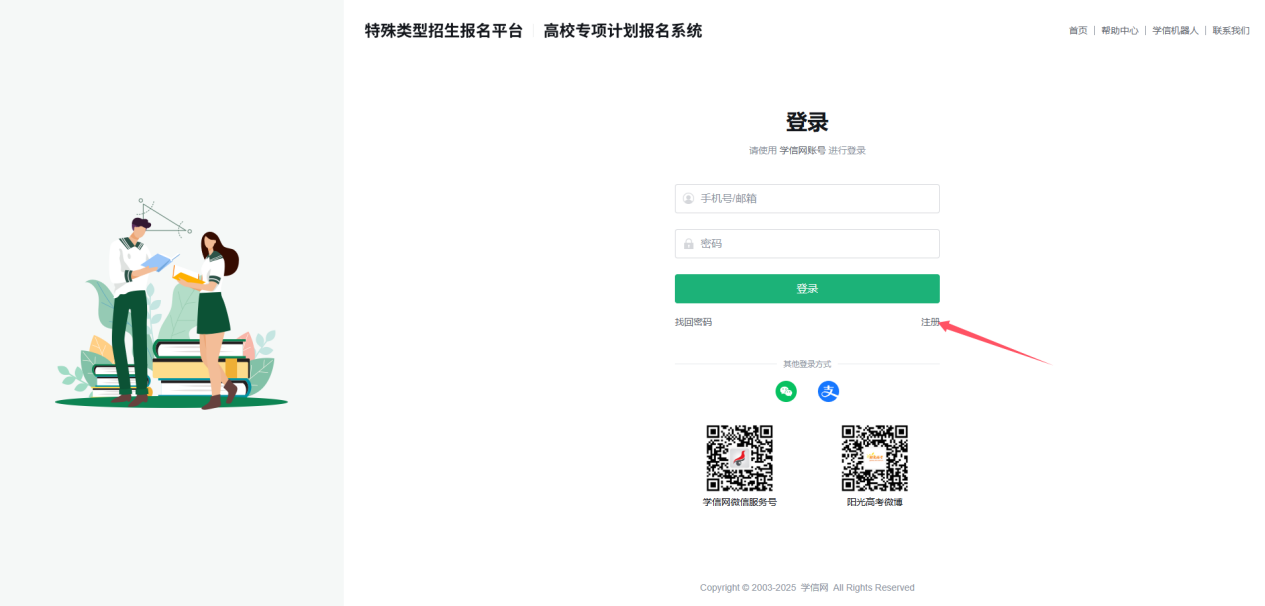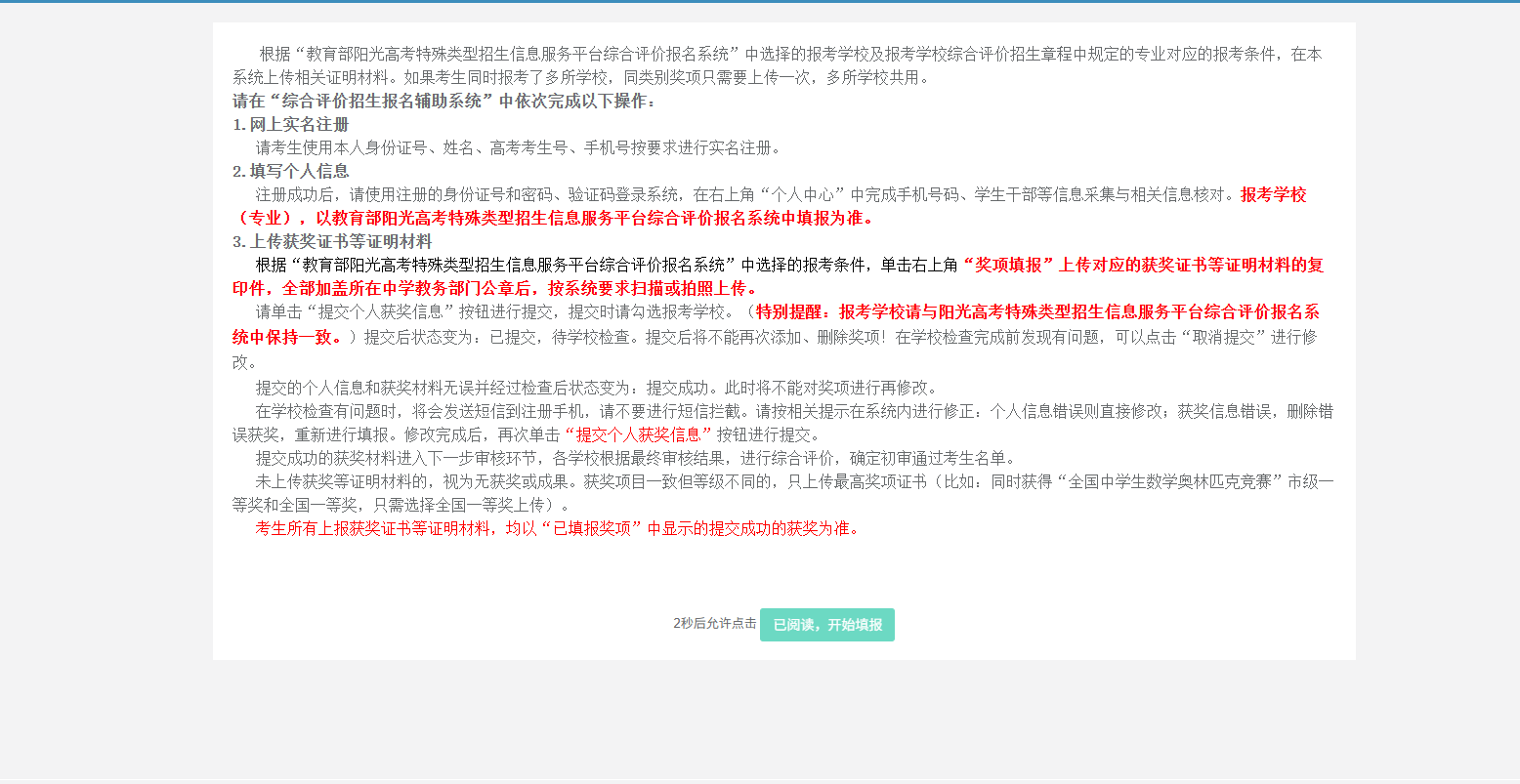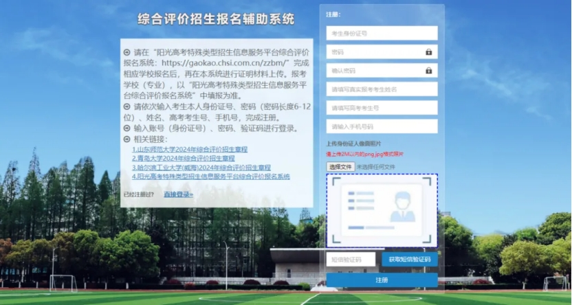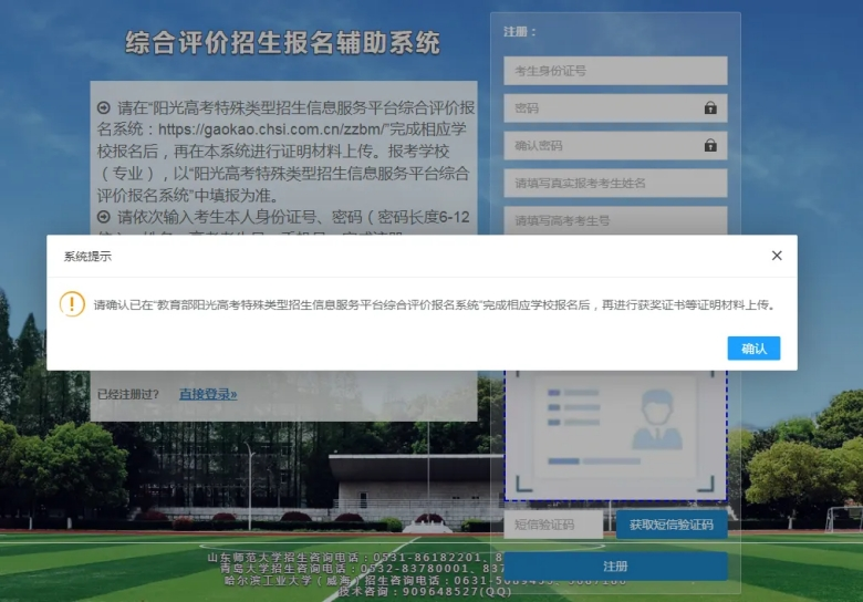 1、注册前请确认已在教育部阳光高考特殊类型招生信息服务平台综合评价报名系统完成报名。