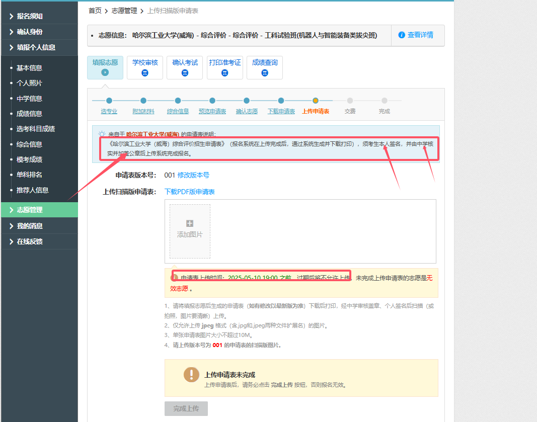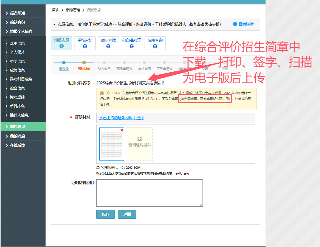 (1)《真实性承诺书》必须在该部分上传,承诺书需在招生简章中下载(见我校本科招生网http://zsb.hitwh.edu.cn)。