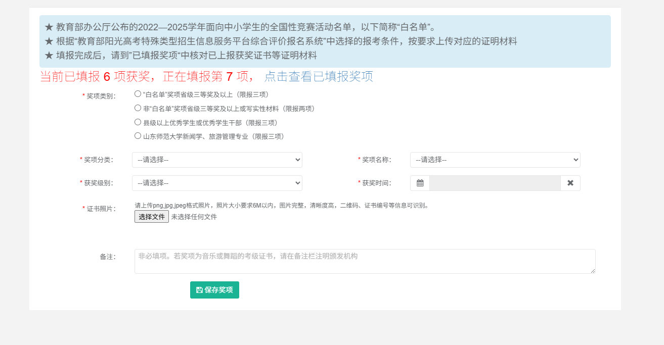 (2)获奖记录部分具体内容登录综合评价招生报名辅助系统,完成注册后,上传符合报名要求的奖项材料,此处教程在下文“综合评价招生报名辅助系统”部分。