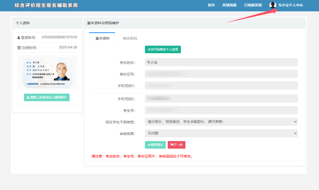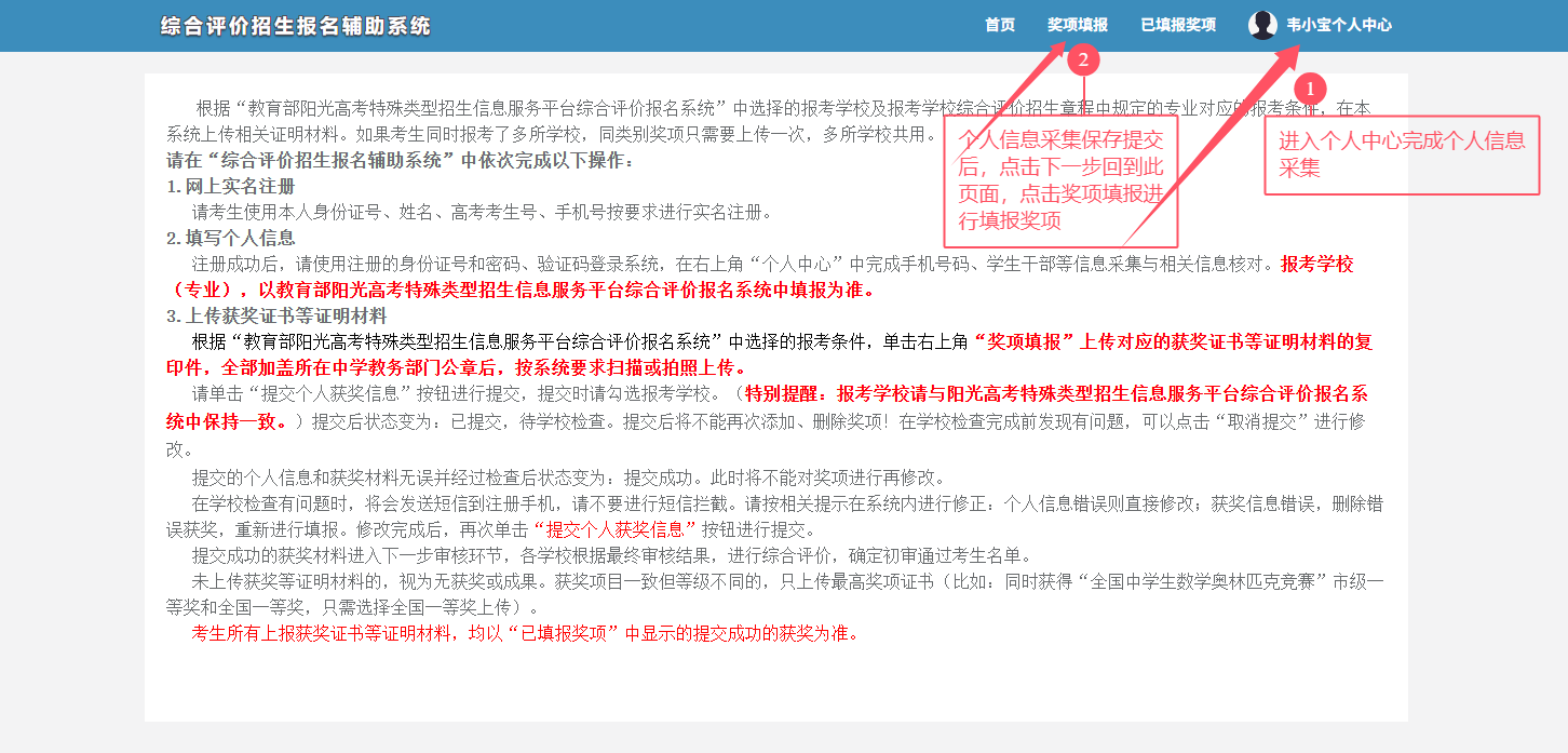 2、在系统右上角“个人中心”中完成信息采集,完成后保存提交,点击“下一步”,进行奖项填报。