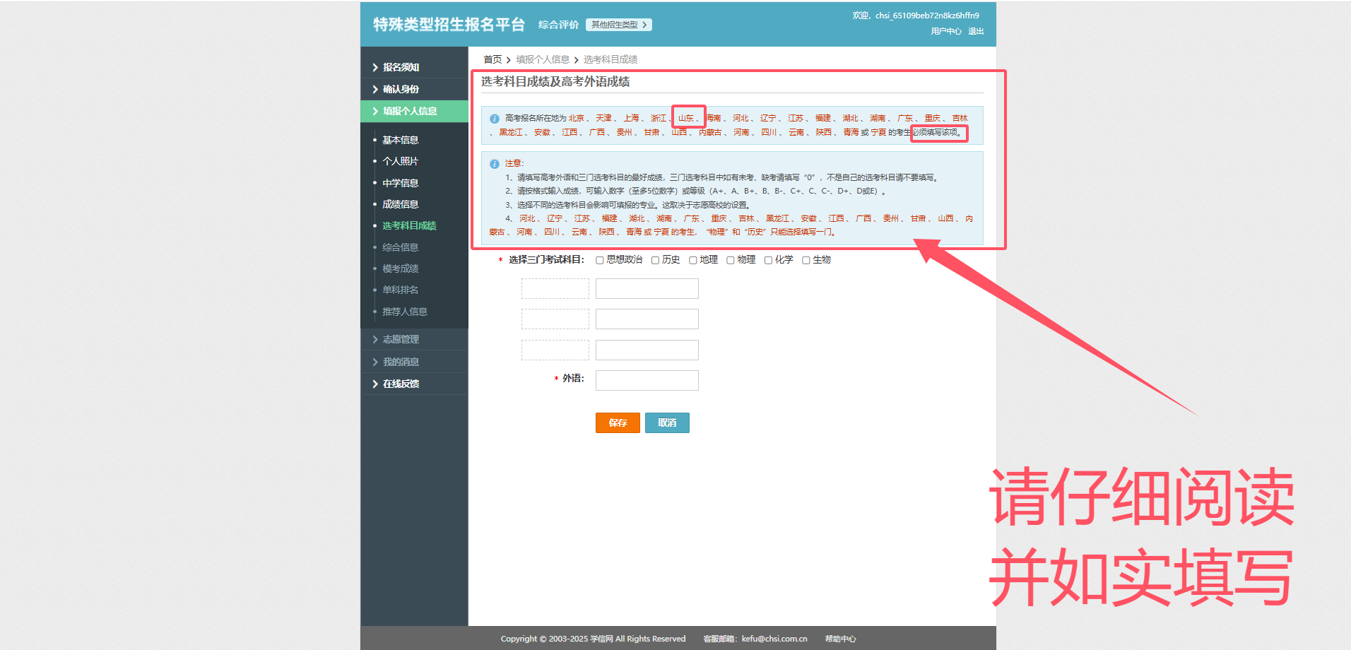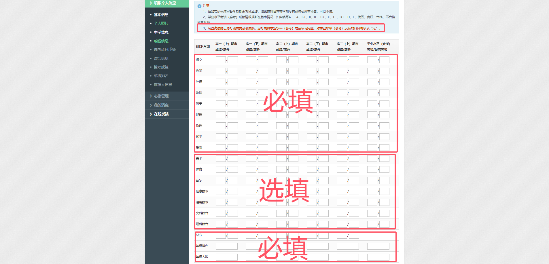 7、请按照要求,填写成绩信息,选考科目成绩可以填该科目日常最好成绩,但选考科目一定要与选择的专业要求相符。