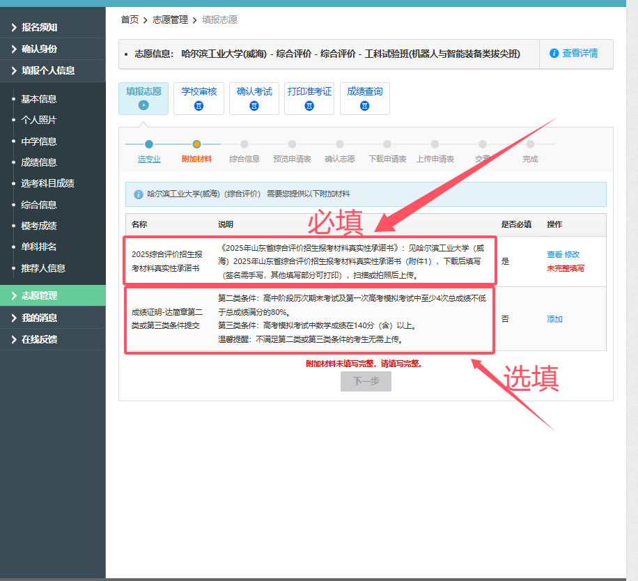 (2)满足第二/三类条件的考生需要上传成绩证明,成绩证明模板需在招生简章中下载(见我校本科招生网http://zsb.hitwh.edu.cn)。