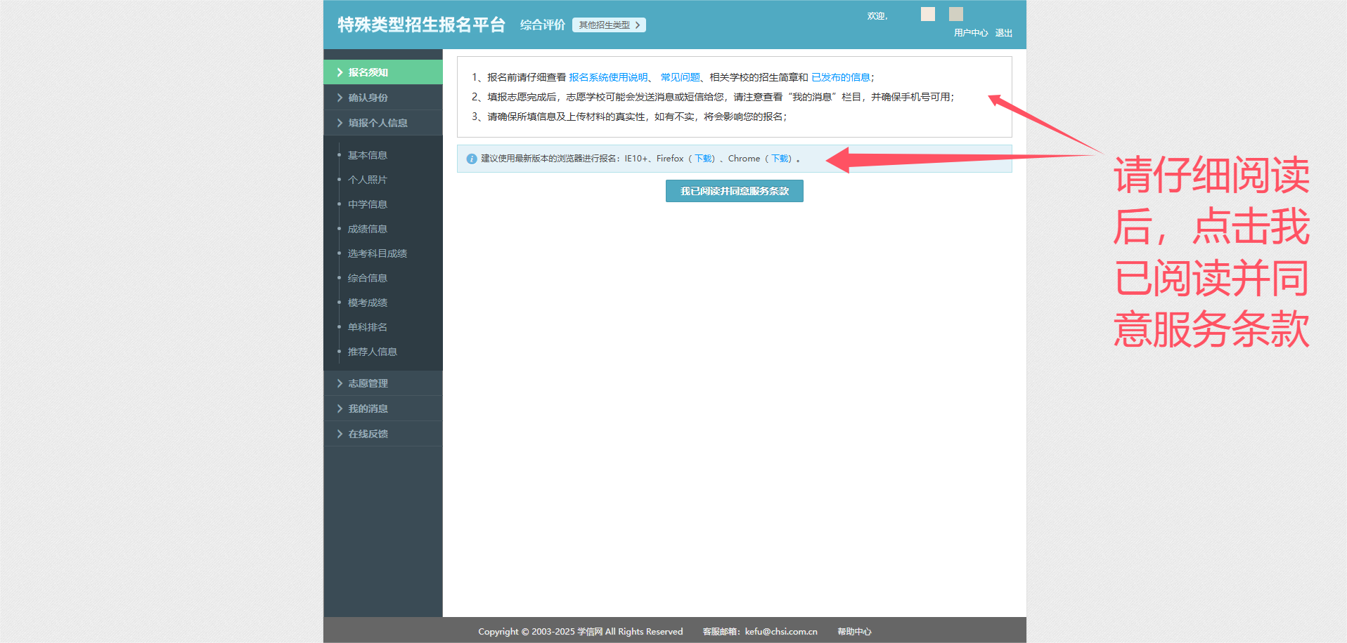 2、成功登录系统后,首先要阅读一下系统使用提示。建议同学们使用报名系统推荐的浏览器进行填报,准备好点击我已阅读并同意服务条款即可开始报名。
