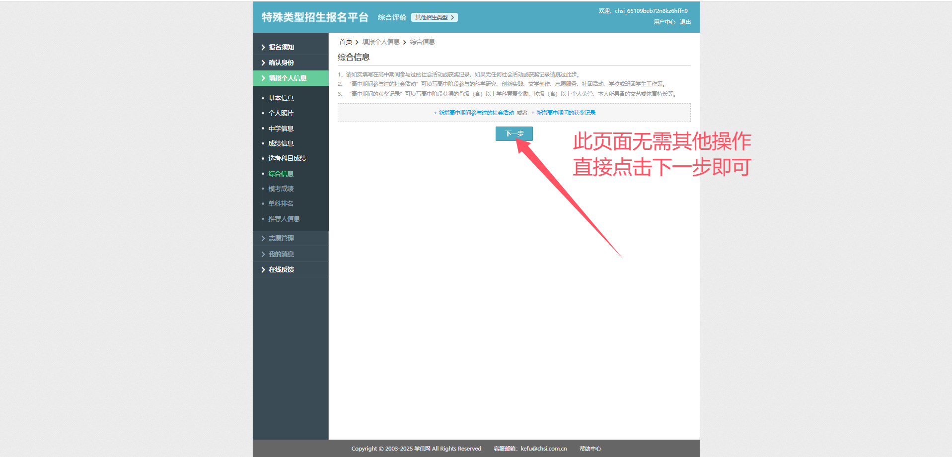 8、此处可直接点击“下一步”,具体内容登录综合评价招生报名辅助系统,完成注册后,上传符合报名要求的奖项材料。此处教程在下文“综合评价招生报名辅助系统”部分。