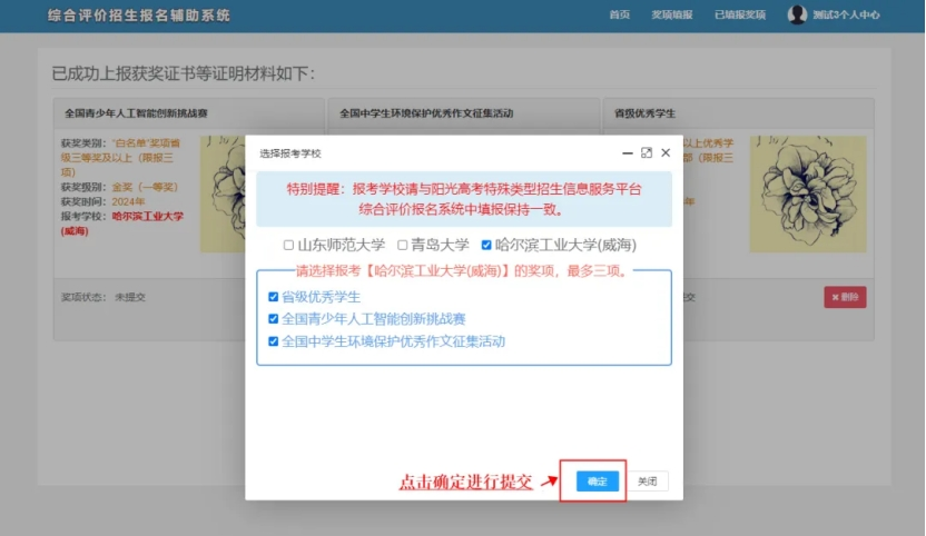 4、所有奖项提交完成后,点击右上角“已填报奖项”可以进行查看,对有问题的证书可以进行删除重新上传,查看确认无误后,请点击“提交个人获奖信息”按钮进行提交,提交时请选择“哈尔滨工业大学(威海)”,勾选报考我校的奖项,最多选择三项。