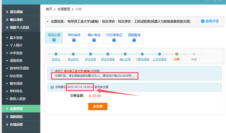 6、请务必在2025年5月10日19:00之前完成缴费。
