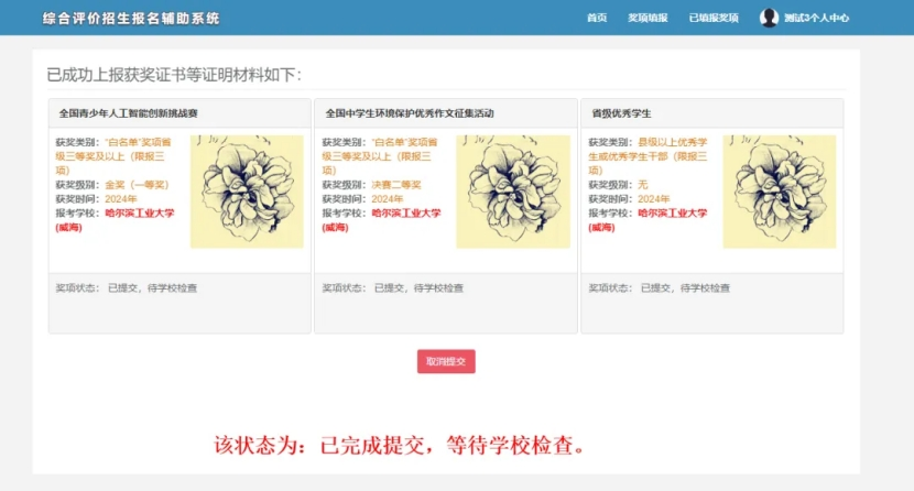 1、提交后状态变为:已提交,待学校检查。提交后将不能再次添加、删除奖项!在学校检查完成前如需修改,可以点击“取消提交”进行修改。提交的个人信息和获奖材料无误并经过检查后状态变为:提交成功,将不能继续修改奖项。