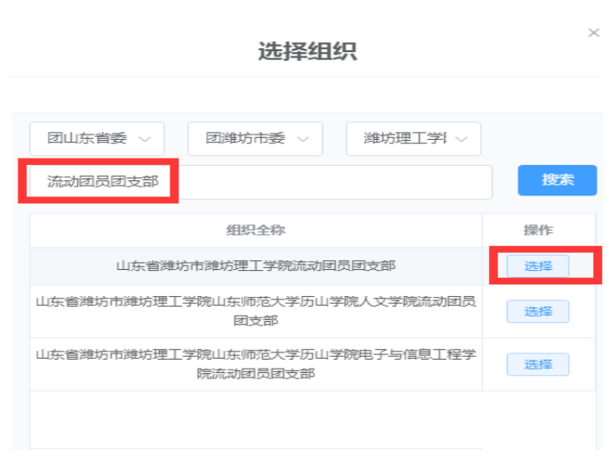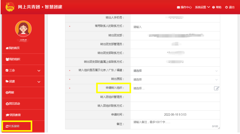 1、新生登录“智慧团建”系统,点击“关系转接”任务栏,填写相关信息,需重点注意在“申请转入组织”一项按照“团山东省委-团潍坊市委-潍坊理工学院团委”的步骤进行选择。