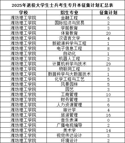 2025年退役大学生士兵考生专升本征集计划汇总表