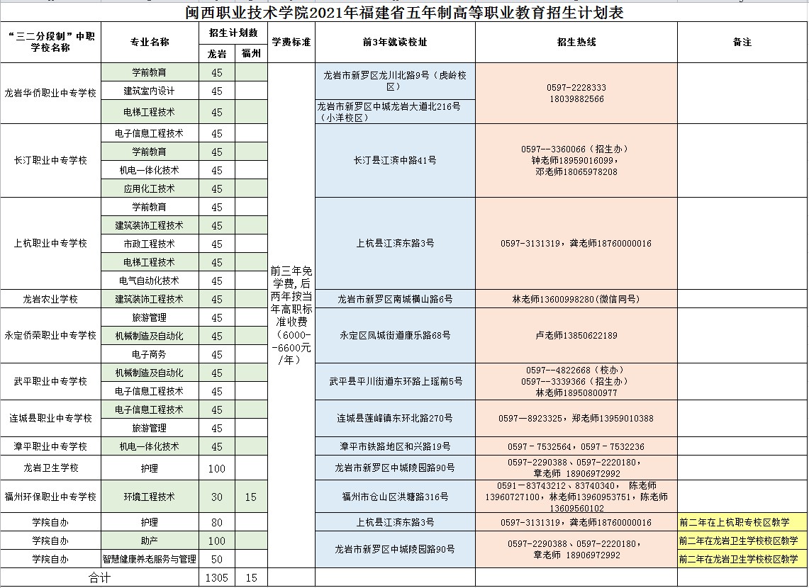 2021年闽西职业技术学院五年制高等职业教育招生计划