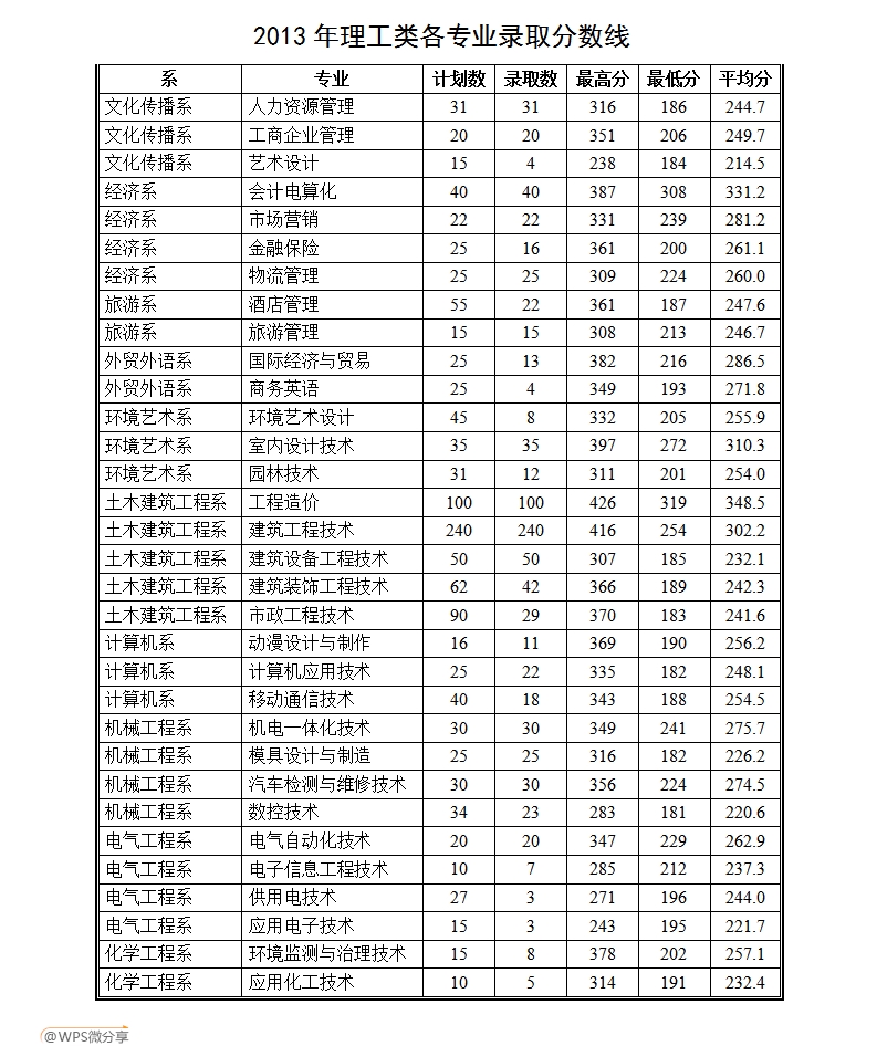 2013年理工类各专业录取分数线