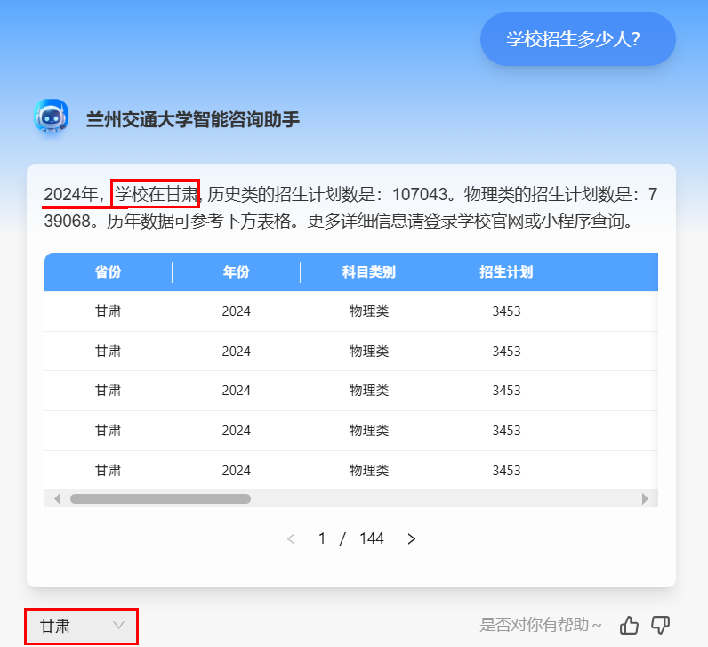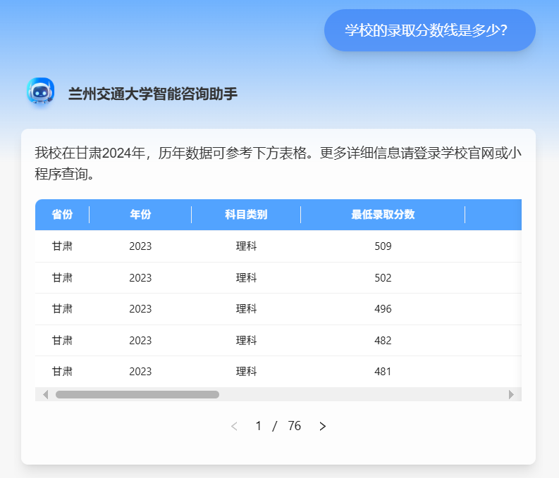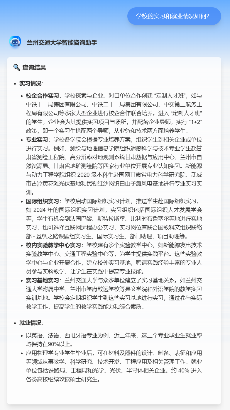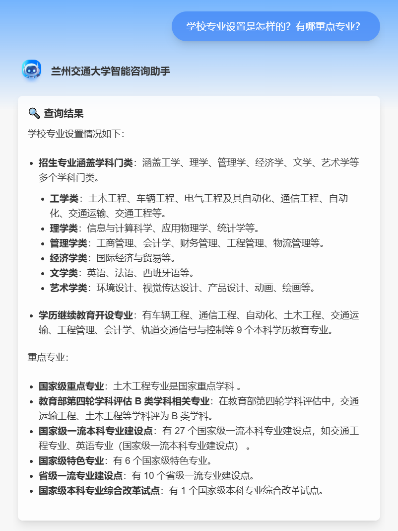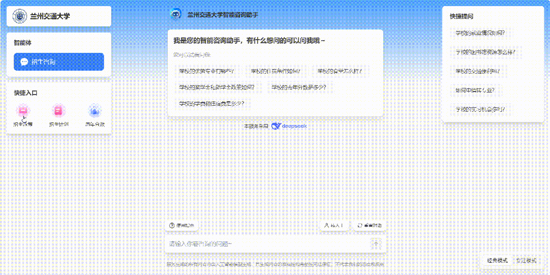 兰州交通大学与Deepseek携手打造的全新智能咨询系统,以AI技术为核心,全面升级招生咨询体验。它不仅打破了线上线下沟通的壁垒,更以多样化的问题回复格式、强大的复杂问题解决能力,为考生和家长提供高效、精准、贴心的招生咨询服务。