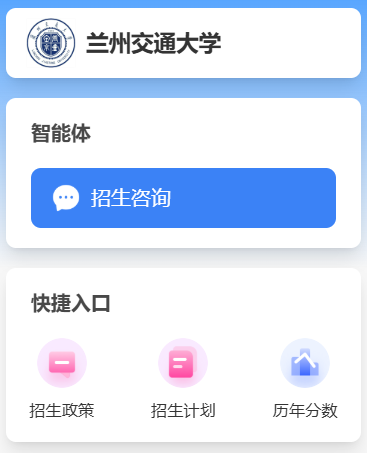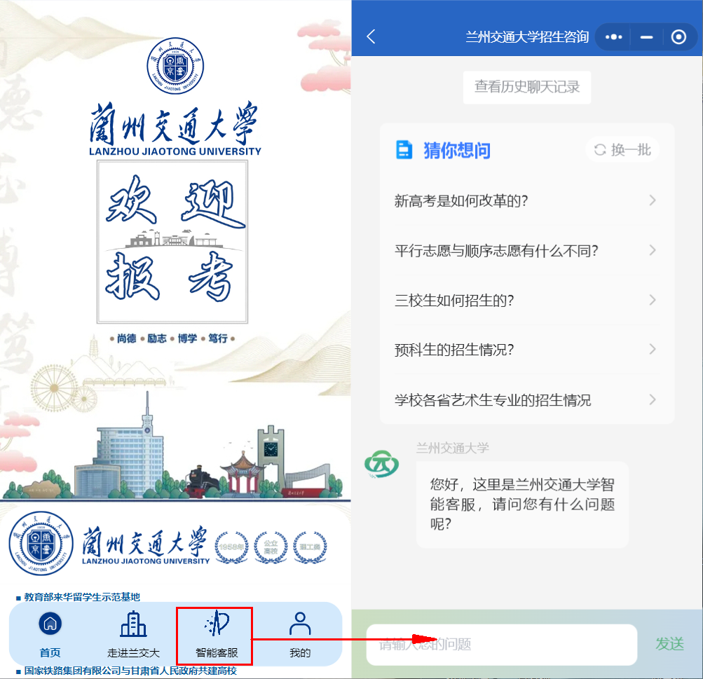 各位学子及家长可通过PC端登录智能咨询网页,或通过移动端“兰州交通大学本科招生”小程序进行招生相关问题的查找与咨询。