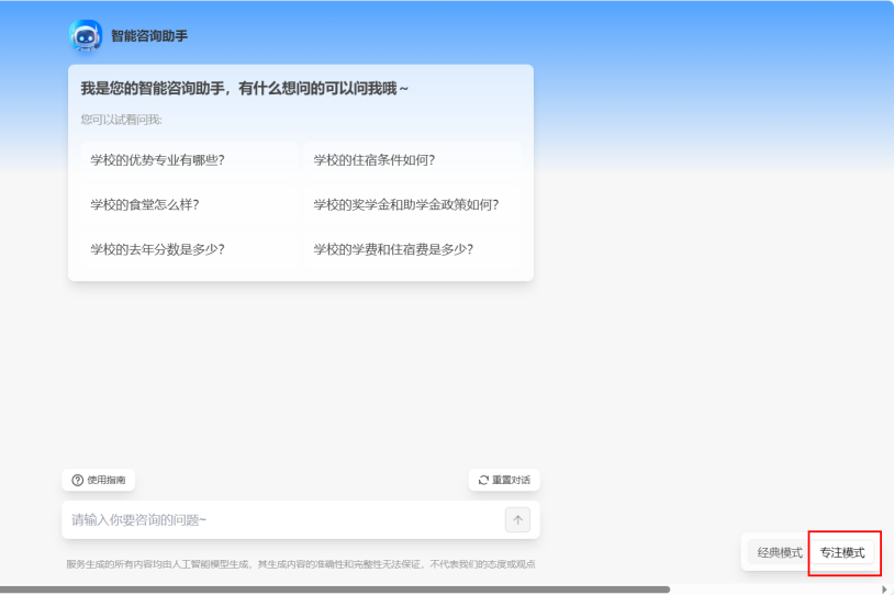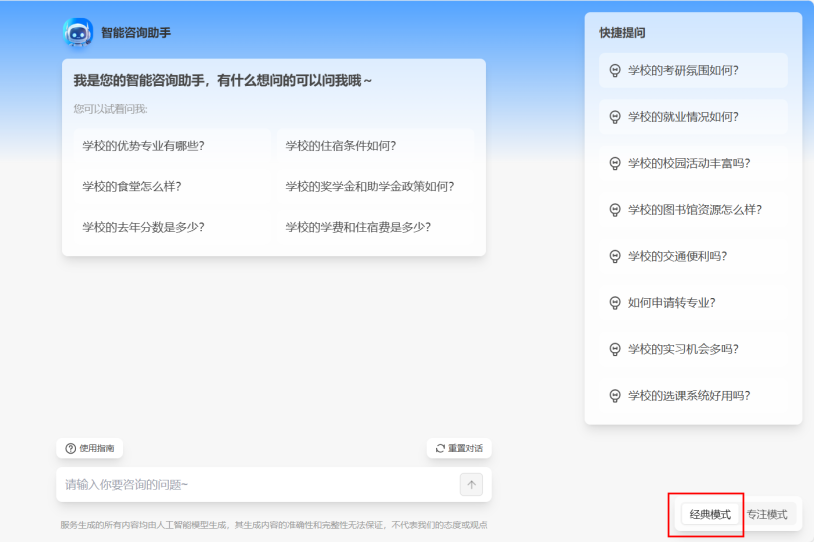 多模式咨询随心选:提供经典模式与专注模式,考生和家长可根据自身需求自由切换。经典模式内容丰富,信息全面;专注模式则更加简洁高效,直击问题核心。