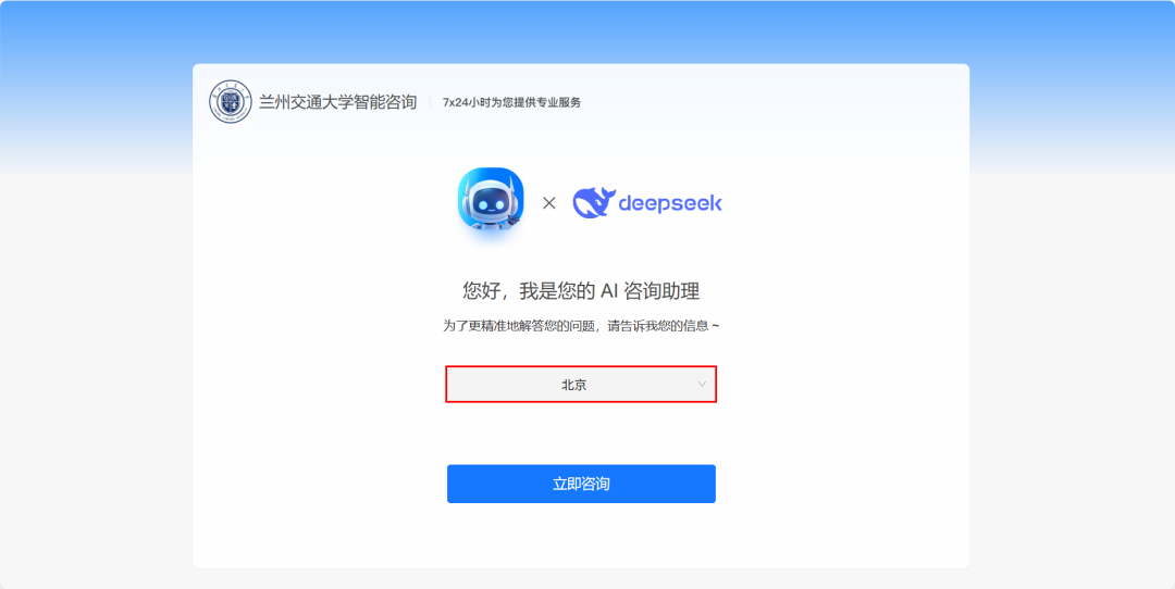 兰州交通大学智能咨询平台网址直达:https://ai.xiaopaicloud.com/0062a72a-4134-4539-ace6-af0622082500