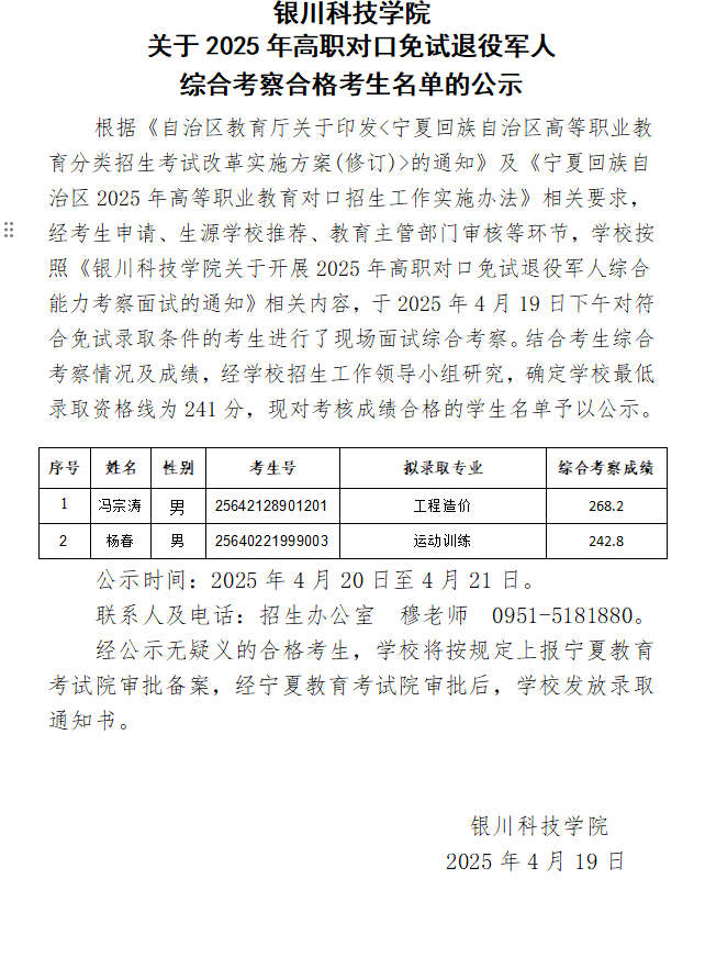 银川科技学院关于2025年高职对口免试退役军人综合考察合格考生名单的公示