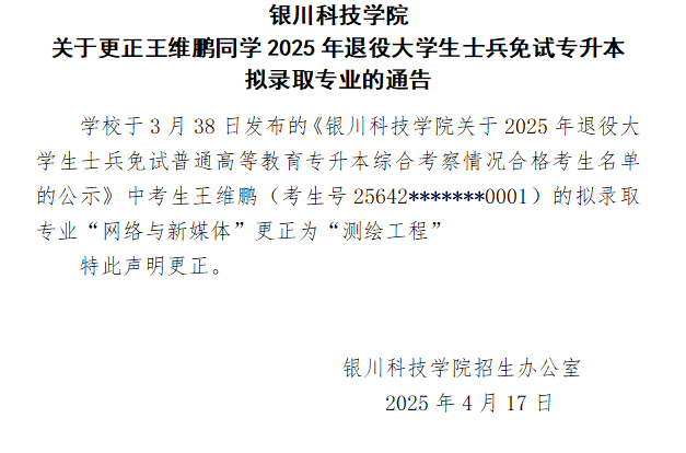 银川科技学院 关于更正王维鹏同学2025年退役大学生士兵免试专升本 拟录取专业的通告