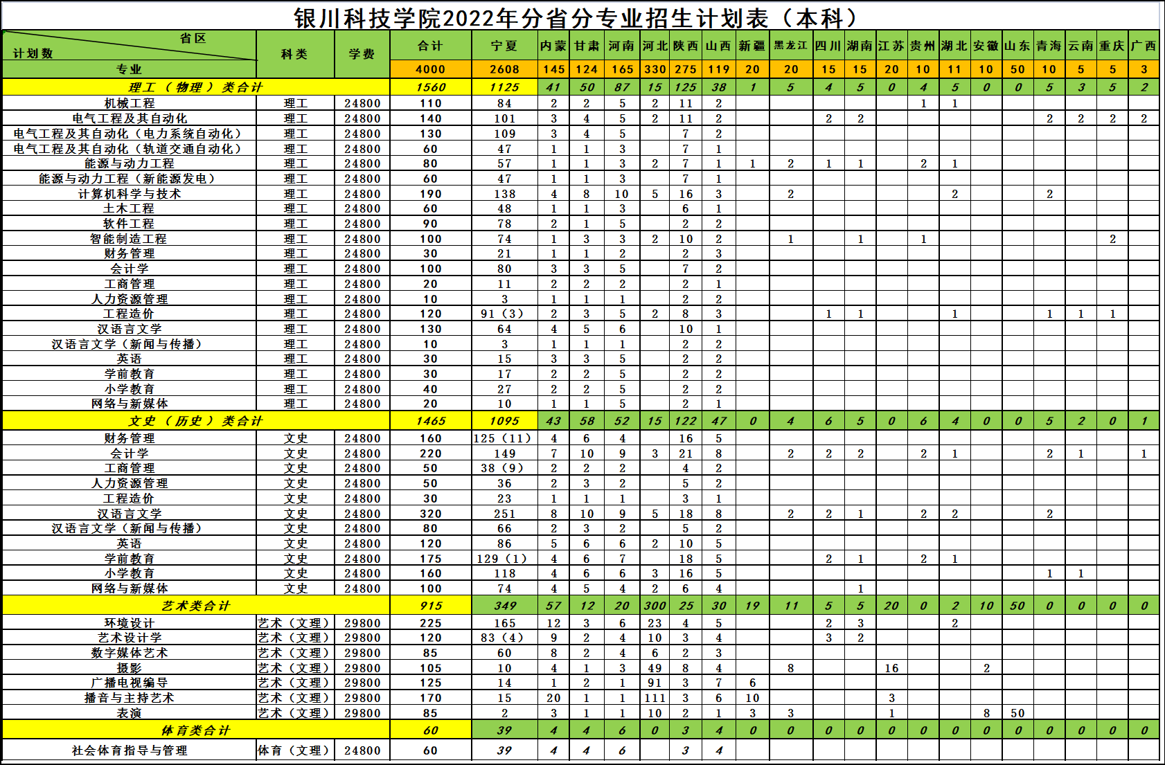 银川科技学院(原中国矿业大学银川学院)2022年分省分专业计划表(本科)