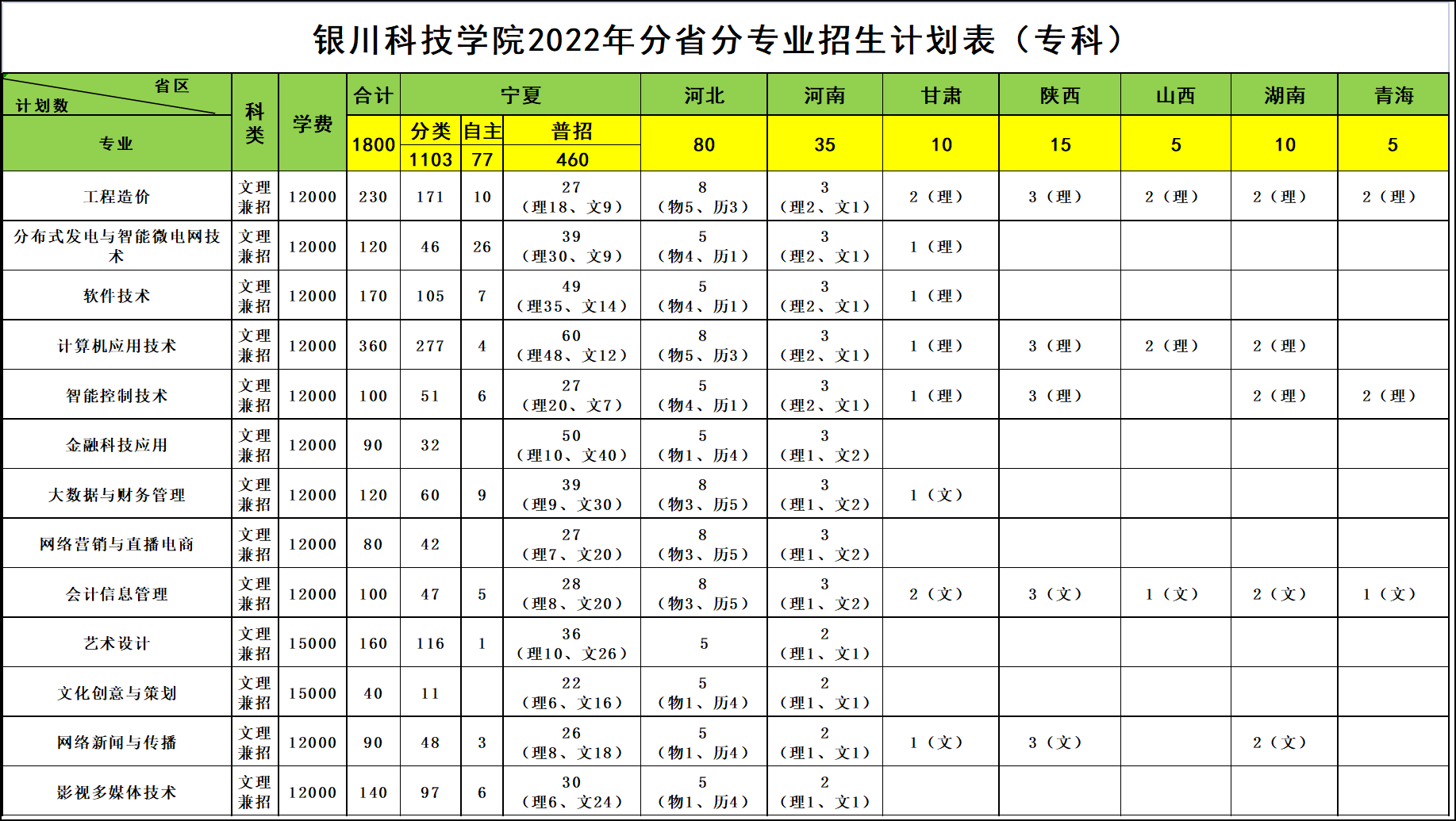 银川科技学院(原中国矿业大学银川学院)2022年分省分专业计划表(专科)