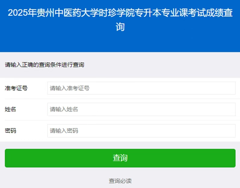 贵州中医药大学时珍学院2025年“专升本”专业课考试成绩已经公布,查询网址:https://h94llbwd.yichafen.com/qz/142ACo1Fvt,考生输入专业课准考证号(11位)、姓名、密码(身份证后6位,若最后一位是字母为大写X)查询成绩,缺一不可。
