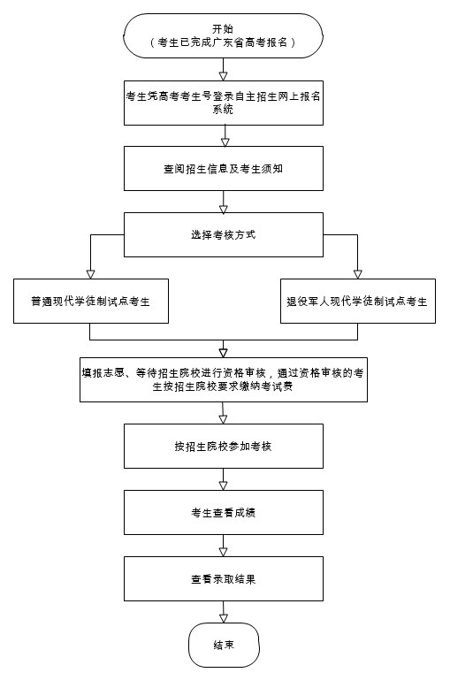 (一)2025年5月7日10:00至10日16:00,考生凭高考报名号及密码登录“广东省2025年高职院校自主招生网上报名系统”(下称网上报名系统,网址:https://pg.eeagd.edu.cn/gzks)报名,签订《诚信考试承诺书》,在“普通现代学徒制试点”(不分考生类型)及“退役 军人现代学徒制专项试点”(不分考生类型)选择一种填报志愿、录入相关报名信息、上传有关证明材料(原件扫描版,下同)。每位考生仅选一种类别一个专业。考生在选择考核方式前,需认真查阅我校招生网站上公布的招生专业考核方式及本简章。经我校确认报考资格后,考生不得更改考核方式。报名及志愿填报工作全部在网上进行,逾期不再办理相关手续。考生报考流程图如下: