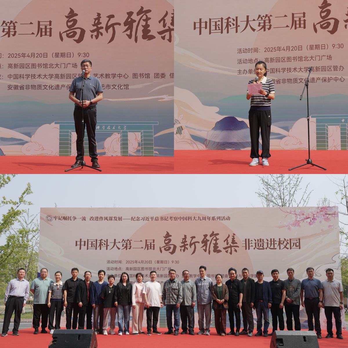 为纪念习近平总书记考察中国科大九周年,培养六有大学生,推进高新园区文化建设,弘扬中华优秀传统文化,4月20日上午,我校在高新园区举办第二届“高新雅集”非遗进校园活动。高新园区建设与管理委员会、本科生院、图书馆、校团委等单位的领导及相关负责人,以及16位安徽省非遗项目传承人出席活动。