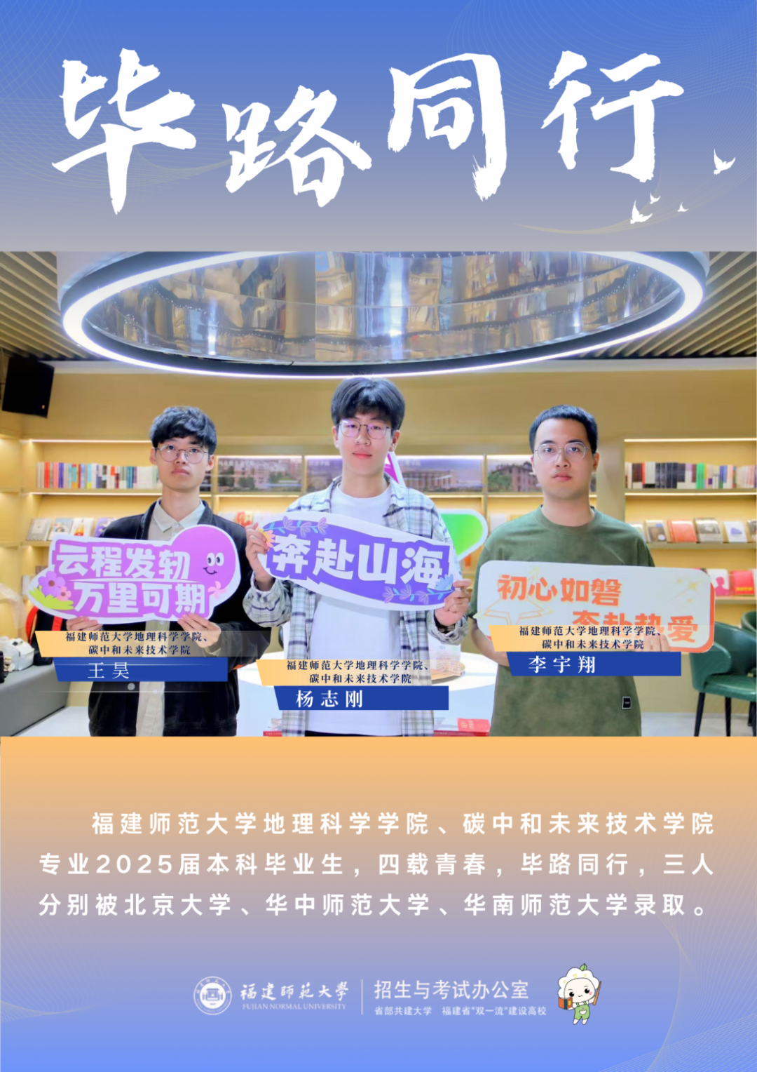 杨志刚、李宇翔、王昊,以实践与学术共筑成长之路。三人均来自国家特色专业,首批国家级一流本科专业——福建师范大学地理科学专业,曾搭档参加全国大学生天文创新作品竞赛、本科生旅游地理调研大赛等赛事。从赛事策划到调研实践,从组织管理到专业深耕,他们始终在积极践行“地理人”知行合一的理念,也最终一同开启升学与卓越成长之门。
