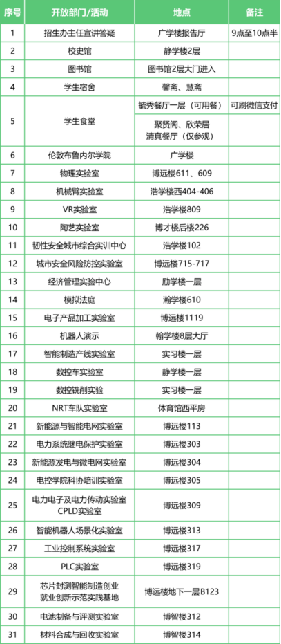 学校校史馆、图书馆、伦敦布鲁内尔学院、部分实验室、学生宿舍开放参观。毓秀餐厅一层可以体验“第九大菜系”:大学食堂!