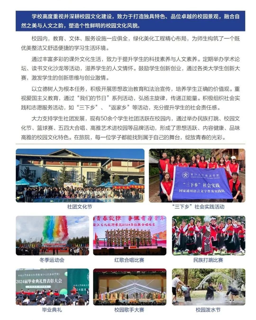 丽江文化旅游学院(原云南大学旅游文化学院)位于享有世界文化遗产、世界自然遗产、世界记忆遗产三项桂冠的云南省丽江市。学校坐落于玉龙雪山下,美丽校园与雪景相映成辉,享有“雪山下最美大学”之美誉。