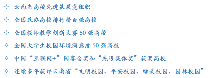 学校分别于2018年、2019年荣获“云南省文明校园”“云南省平安校园”荣誉称号,均是省内首家获此殊荣的独立学院。2020年获得中国国际大学生“互联网+”创新创业大赛国赛“先进集体奖”和红旅赛道金奖,是当年云南省唯一获得此项殊荣的高校。学校高度重视党建和思想政治工作,2022年是唯一获评意识形态工作责任制考核“优秀”的民办高校,2023年党建积分制考核结果为“优秀”。在2023年全国高校教师教学创新大赛中,学校是云南省唯一同时获得国家级一等奖、二等奖的高校,是全国民办高校中唯一获得一等奖的高校,进入全国50强。在2024年全国高校外语教学大赛中包揽省级特等奖,代表云南赛区斩获国家级二等奖、三等奖和教学设计特等奖、三等奖。截至目前,学校获得认定国家级一流本科课程3门,省级一流本科课程14门。