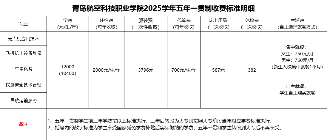 青岛航空科技职业学院2025学年五年一贯制收费标准明细公示