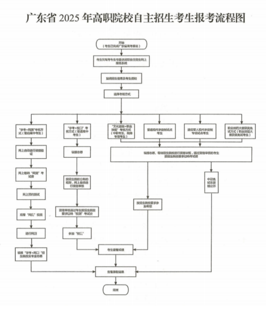 考生凭高考报名号及密码登录“广东省2025年高职院校自主招生网上报名系统”(下称“网上报名系统”,网址:https://pg.eeagd.edu.cn/gzks/)报名,签订《诚信考试承诺书》,在“普通现代学徒制试点”(不分考生类型)、“退役军人现代学徒制专项试点”(不分考生类型)两种考核方式中选择一种填报志愿,录入相关报名信息、上传有关证明材料(原件扫描版,下同)。经本校确认报考资格后,考生不得更改考核方式。考生报考流程图详见附件1。