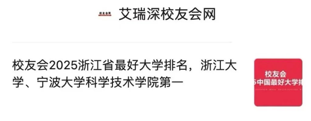 根据艾瑞深校友会网显示,艾瑞深校友会2005-2025年浙江省民办大学排名上榜中,我校表现最为优秀,实力最强,水平最高,最具竞争力,20次跻身全国百强。2025年位居全国第11,荣登2025浙江省最好民办大学排名首位。