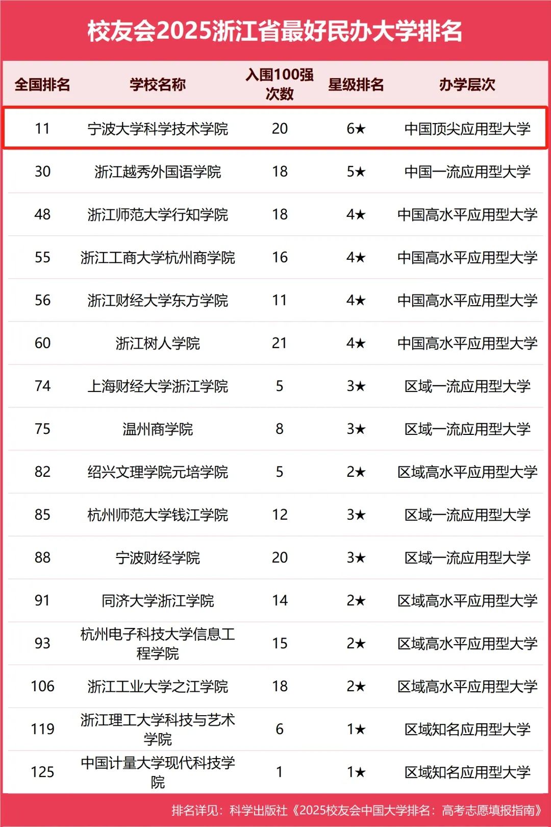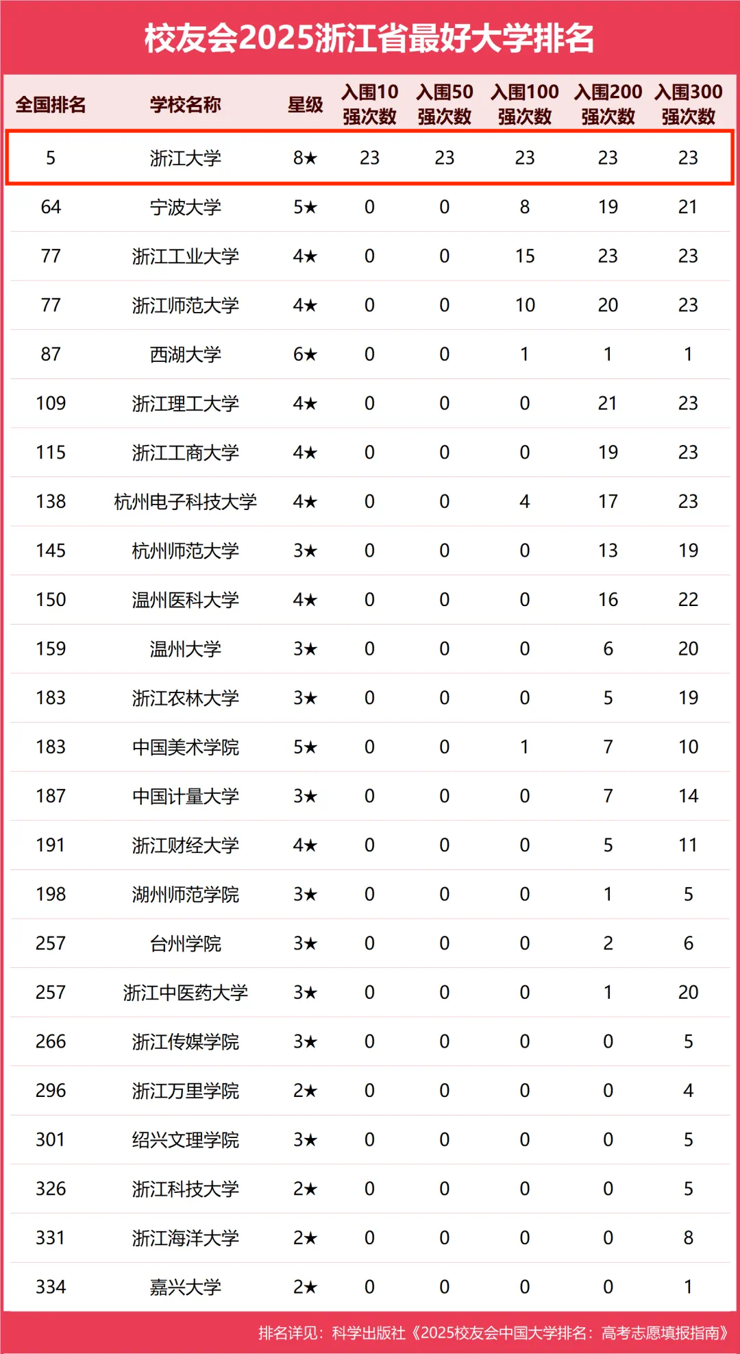 校友会2025浙江省最好大学排名依据浙江省大学入围校友会2003-2025中国大学排名300强情况统计得出,其中民办高校和高职院校为入围全国前100强高校。