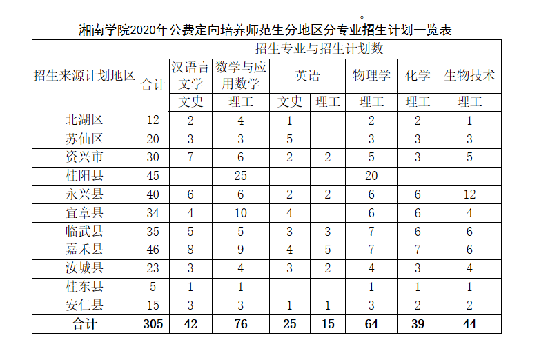 湘南学院2020年公费定向培养师范生分地区分专业招生计划一览表