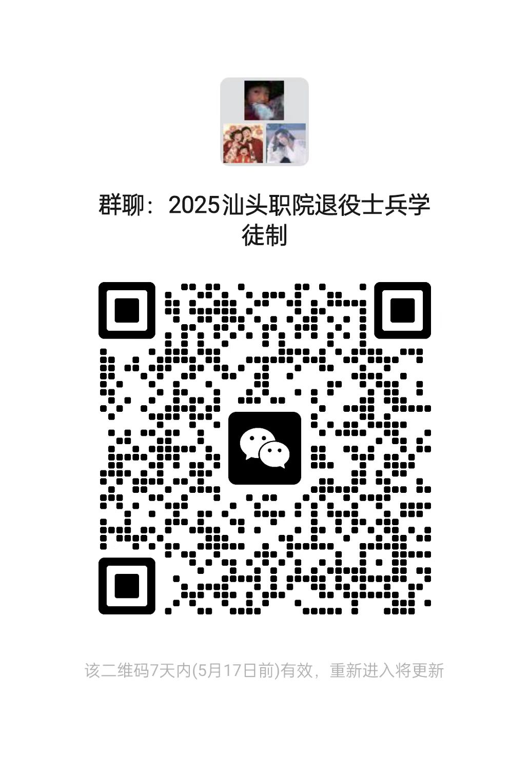 请各位已经通过审核的退役士兵学徒制专项的考生,扫描下方二维码入群(群名2025年汕头职院退役士兵学徒制),后续考试相关事项将在群里进行公布。