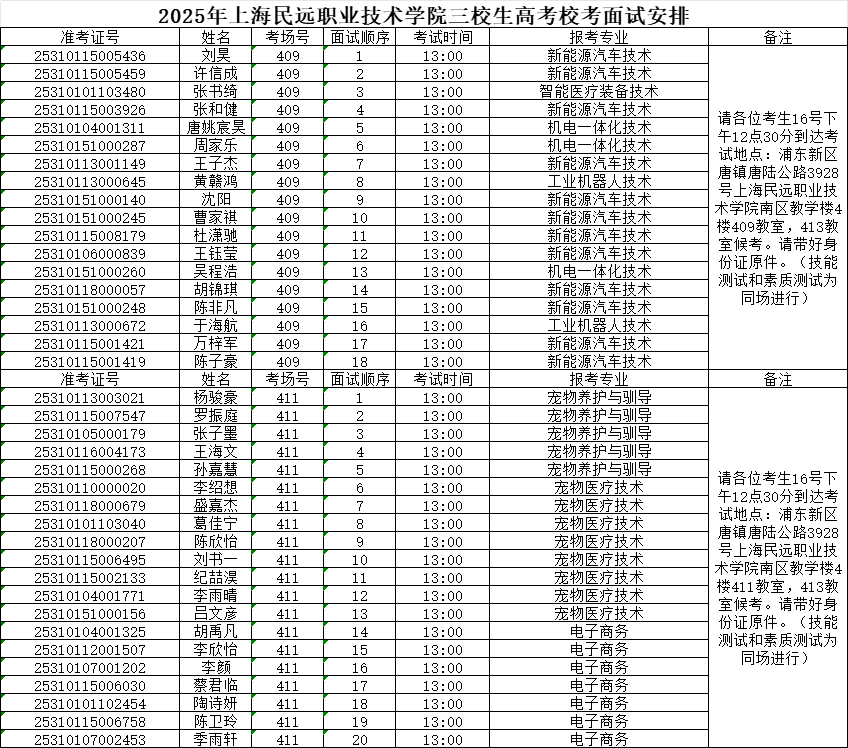 2025年上海民远职业技术学院三校生高考校考面试安排