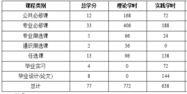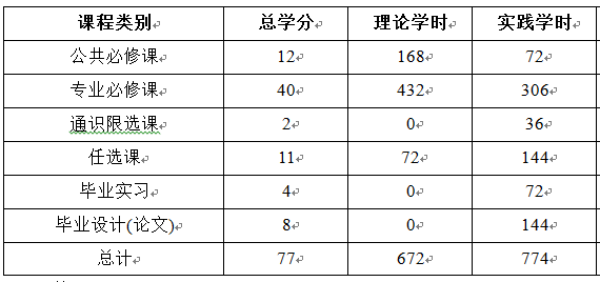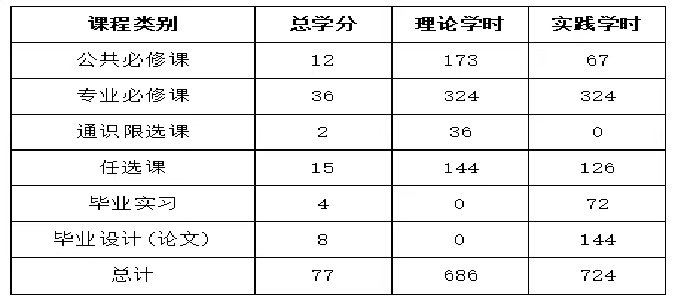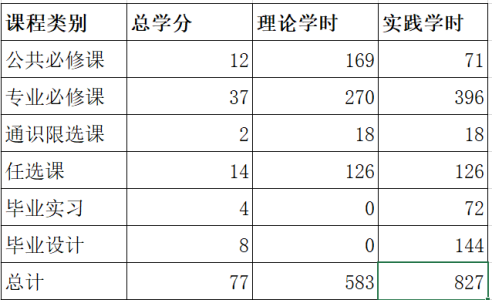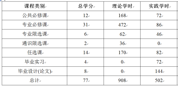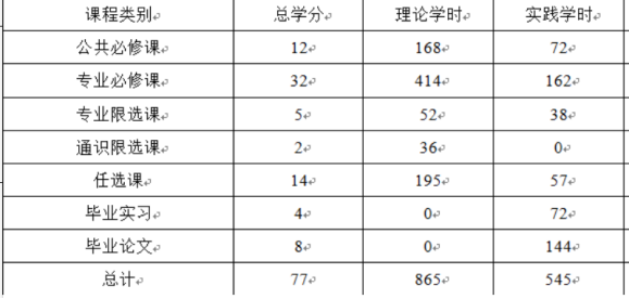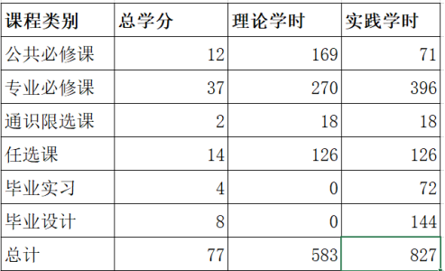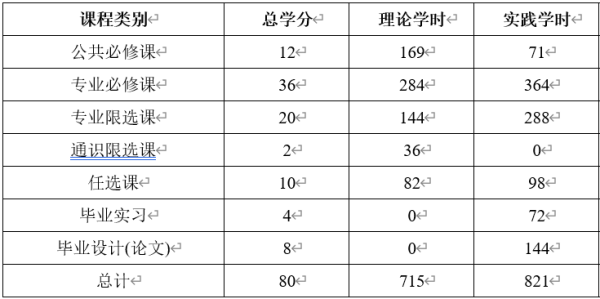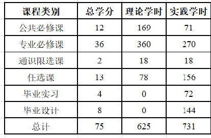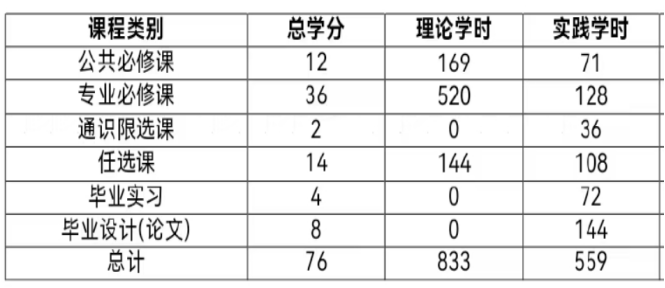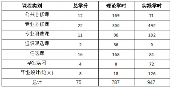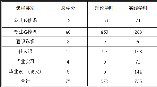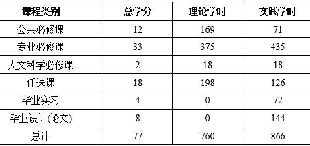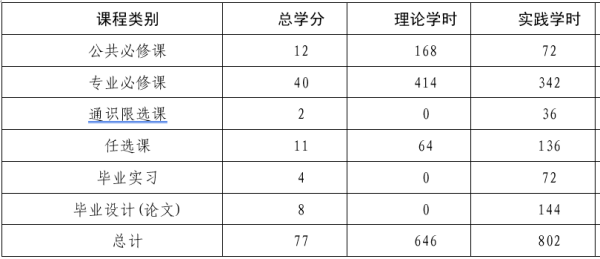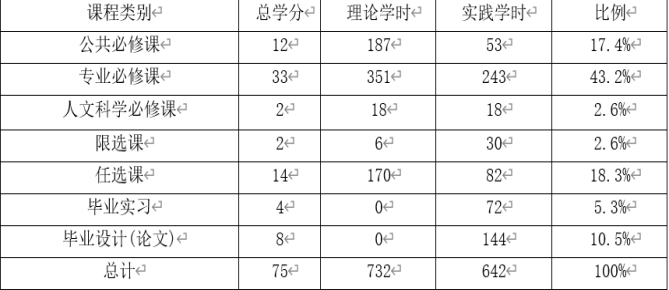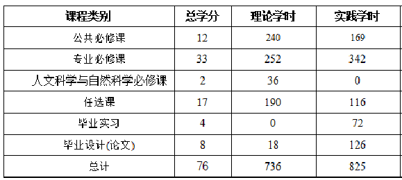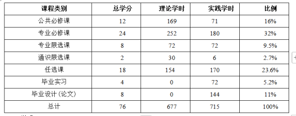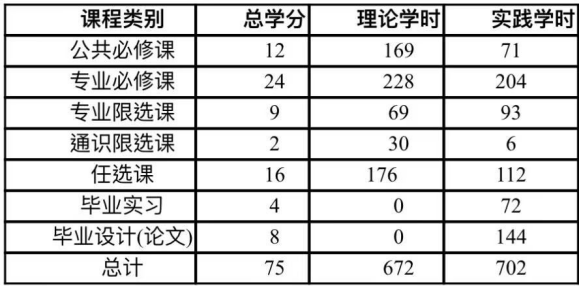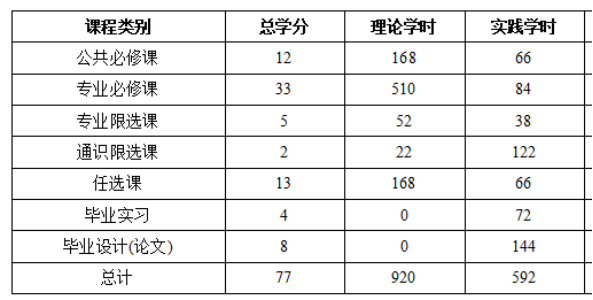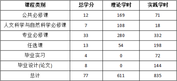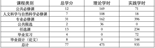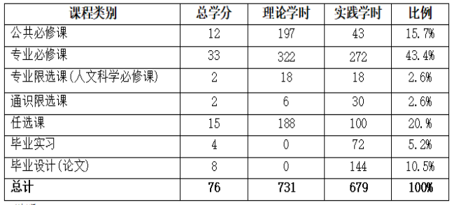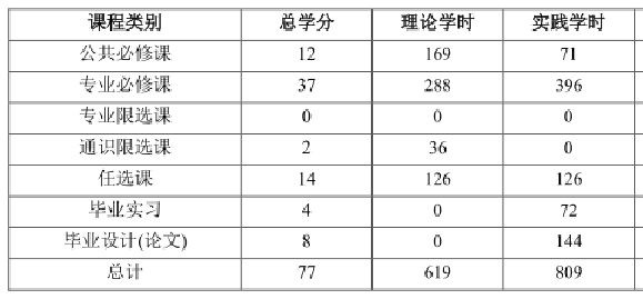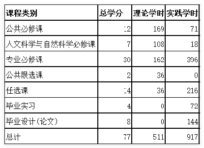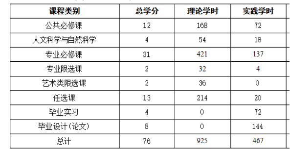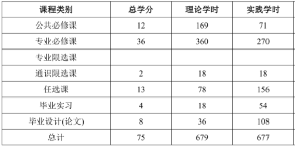 其中,公共必修课(12学分),人文科学与自然科学必修课(2-7学分),专业必修课(28-33学分),限选课(0-2学分),任选课(13-20学分),毕业环节(12学分)。