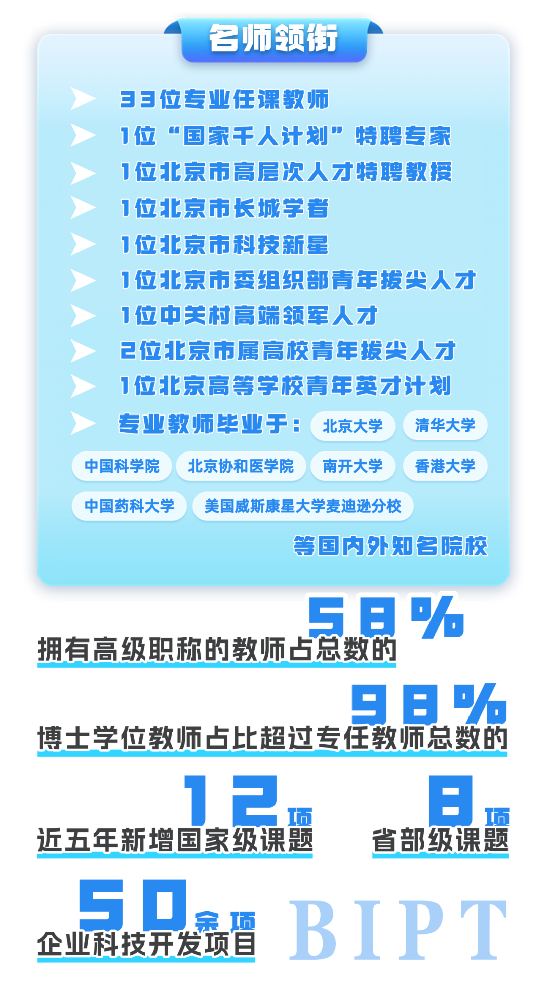 专业优势面向国家“十四五”规划需求,培养从事生物制药领域产品研发、工程设计、生产管理及专业技术服务等工作的高素质应用型人才,以我校高素质应用型人才培养定位为基准,坚持立德树人,服务北京创新发展“双发动机”之一的生物医药健康产业。