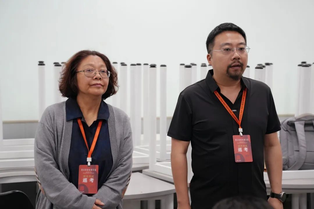 ▲播音主持学院院长赵小蓉教授(左)、副院长周欣教授(右)巡视各答辩场