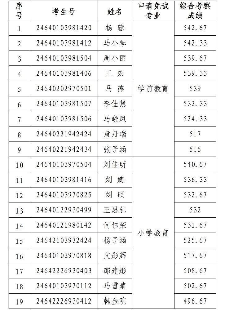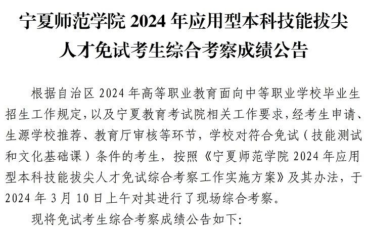 宁夏师范学院2024年应用型本科技能拔尖人才免试考生综合考察成绩公告