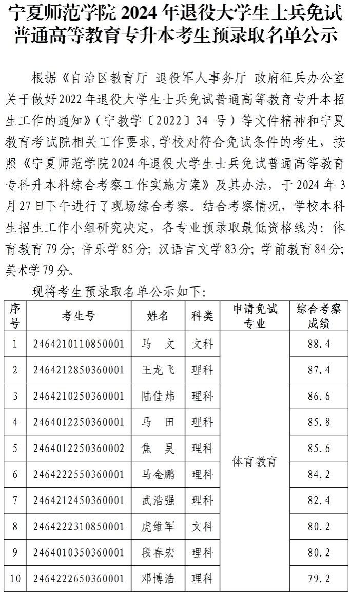 宁夏师范学院2024年退役大学生士兵免试普通高等教育专升本考生预录取名单公示