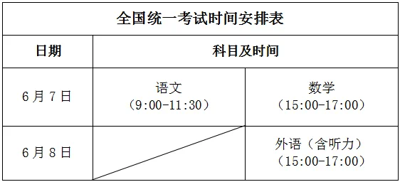 (1)全国统一考试。全国统一考试科目考试时间安排在6月7日全天和6月8日下午,其中语文考试时长为150分钟,数学、外语考试时长均为120分钟。