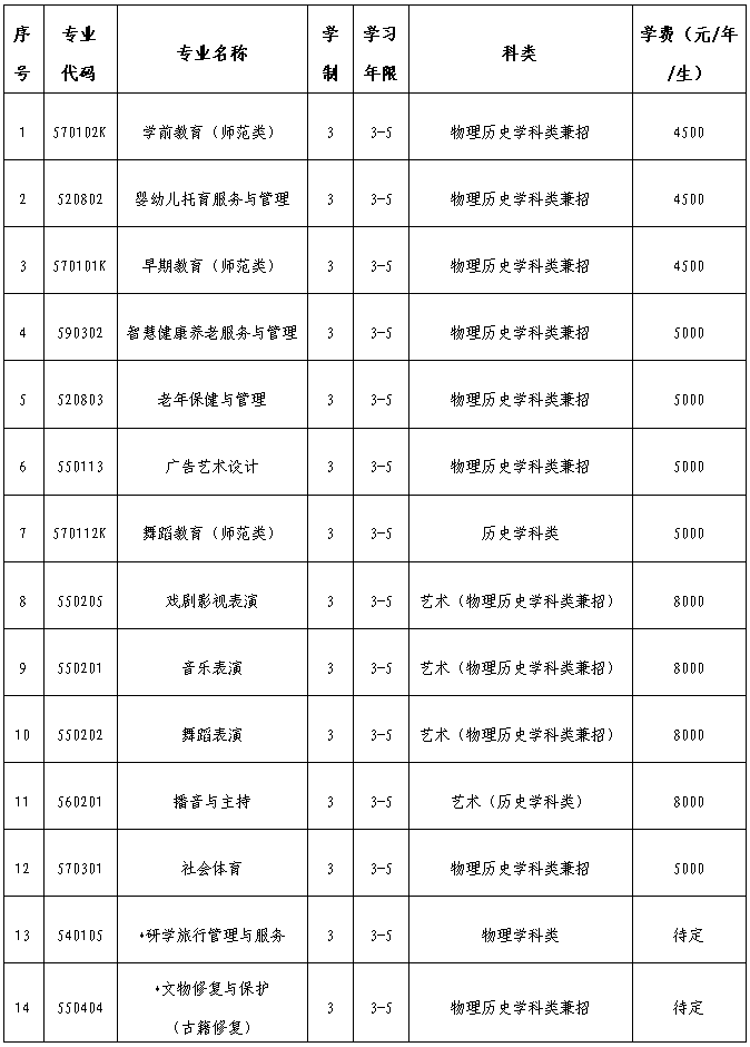 按照省物价部门批准的标准向学生收费。学前教育专业(师范类)、婴幼儿托育服务与管理专业和早期教育专业(师范类)学费标准:4500元/年;舞蹈教育专业(师范类)、广告艺术设计专业、智慧健康养老服务与管理专业、老年保健与管理专业和社会体育专业学费标准:5000元/年;艺术类各专业学费标准:8000元/年;研学旅行管理与服务和文物修复与保护(古籍修复)学费待定;住宿费标准:800元/年。